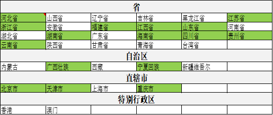 2、籍贯要求为下表绿色所列省市。若户口在北京的,要求是从外地转入北京的人员。